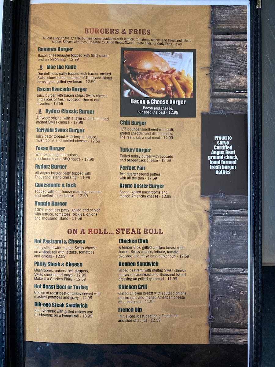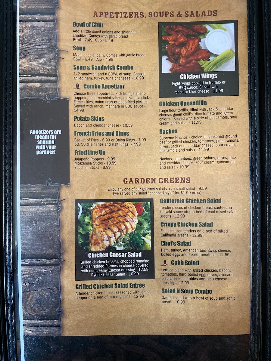 The menu at Ryderz is a treasure trove of flavors, offering a wide selection of mouthwatering options. Start your meal with their delectable Combo Appetizer Sampler, allowing you to choose from a variety of tempting bites, such as jalapeño poppers and fried zucchini sticks. The warmth of the Bowl of Chili is especially popular during cooler days, generously topped with cheese and accompanied by crusty garlic bread.